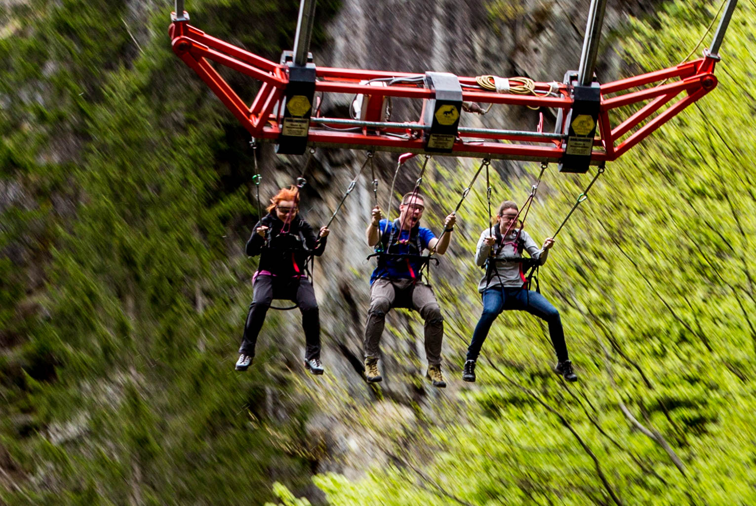 Megadive is a 70m high swing, fixed on a very high bridge, something that’s never been done in Europe. Up to 4 people can swing together through the valley with very high speed. Riders will go from experiencing the grip of multiple G force to the weightlessness of zero gravity within seconds. Using professional, top-of-the-line equipment, you’ll speed through the air solo or tandem at 140 kilometers per hour while swinging like a pendulum.
