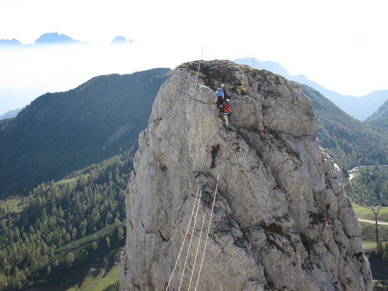 The climbing paradise Nassfeld provides an unique attraction: the via ferrata “Däumling” (“Little Thumbling“), which is situated freely accessible in the Gartnerkofel Massif. The secured via ferrata has been graded as a category B/C level of difficulty and is 500 metres long. Climbing enthusiasts must conquer 150 metres in altitude in order to reach the highest point of the “Däumling“. Summit conquerors enjoy a stunning view across the Carnic and the Julian Alps on their way up to the roof of the rock tower.